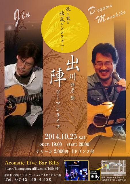 お待たせいたしました! 次回ライヴが決定いたしました♪ 出川雅彦&陣 ツーマンライブ 「秋の虫と秋風のシンフォニー」 虫シリーズで有名な プーちゃんこと出川雅彦さんの地元・奈良で 彼の弾き語りと 陣さんのインストの共演です 秋の夜長に笑い通す虫の物語と 秋風の清涼感を どうぞ満喫してくださいませ 2014年10月25日土曜日 open 19:00 start 20:00 チャージ 2000円ワンドリンク付 Acoustic Live Bar Billy http://homepage2.nifty.com/billy34/ 奈良市大宮町6丁目7−1 カイモト第3ビル二階 0742-36-435