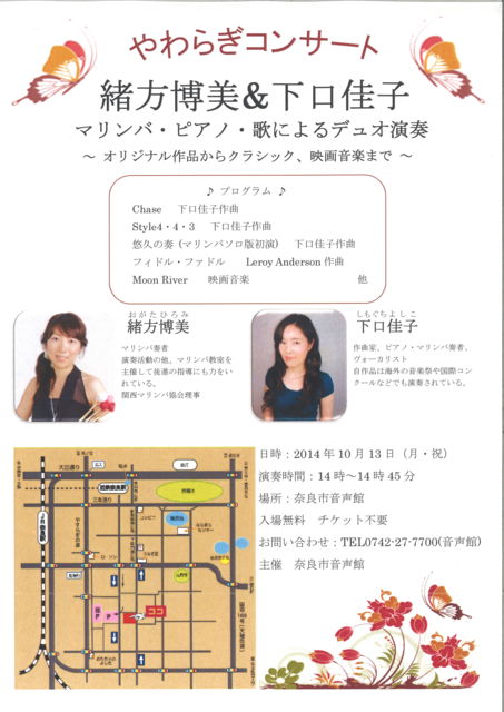 【緒方博美&下口佳子マリンバコンサート】 10月13日(月・祝)奈良市音声館で、下口佳子作曲のマリンバ作品『Chase』、『Style4・4・3』を始め、クラシックや映画音楽をマリンバ・ピアノ・歌でデュオ演奏いたします♪ 入場無料でチケット不要です。 『悠久の奏』(下口佳子作曲)のマリンバソロ版初演もありますので、ぜひよろしくお願いします☆ 日時:2014年10月13日(月・祝) 演奏時間:14時〜14時45分 場所:奈良市音声館 入場無料 チケット不要 お問い合わせ:TEL0742-27-7700(音声館) 主催 奈良市音声館