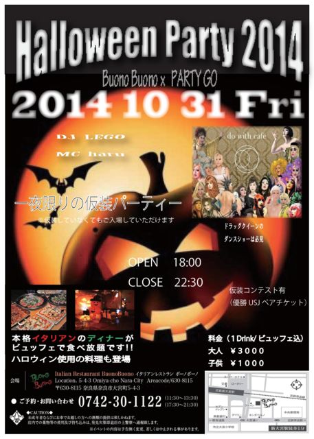 今年の仮装はお決まりです 10月31日はBuonoBuonoのハロウィン仮装パーティーへ 大人 ¥3000(1ドリンク、ビュッフェ込) 小人 ¥1000(1ドリンク、ビュッフェ込) ※小学生以下 OPEN 18:00〜 イベント 19:30〜 CLOSE 22:30 今回はジョニーエンターテイメントとのコラボレーションで、恋活も盛り込みました ピンクのリストバンドの人は 恋活 それ以外の人は青のリストバンド イベントにはドラッグクイーンを招いての ダンス&トークショー もちろん、