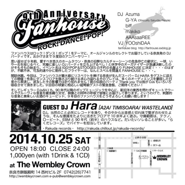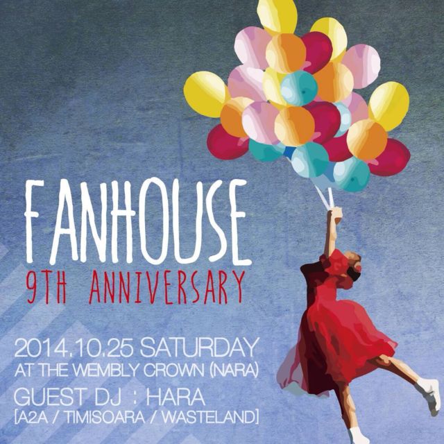 ★fanhouse vol.41 - 9th Anniversary!! - 2014/10/25(sat) at The Wembley Crown(奈良) http://wembleycrown.com/ start 18:00 close 24:00 charge : 1,000yen(W/1Drink+1CD) *Guest DJ HARA[A2A/TIMISOARA/WASTELAND] *DJ Azuma / G-YA / biff / makiko / AAAsaaREE *VJ YOOshiDAA http://fanhouse.exblog.jp/ /// The Wembley Crown /// 奈良市餅飯殿町14 西村ビル2F (近鉄奈良駅から徒歩10分、JR奈良駅から徒歩15分) TEL : 0742-26-7741 http://wembleycrown.com/