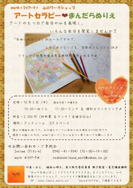 新しいワークショップのお知らせです♪ 10月より、心のワークショップ ランチ付きで開催します! 場所は、カフェ雑貨のお店Intimeアンティームさん。 2階の教室スペースをお借りします。 午前中開催、お子様連れOKですので、 お子さんが幼稚園や学校に行かれている間に… 小さいお子さんと一緒の生活で、なかなか自分のための時間が取れない… という方にもオススメです!! 明るくのんびりとした空間で、みんなでアートセラピーしましょう♪ ぬりえのあとは、美味しいランチを食べながらの個別カウンセリ