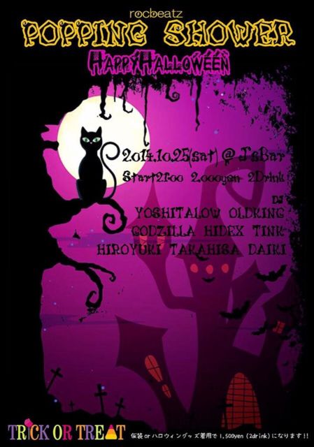¡ùPOPPING SHOWER¡ùVer.HALLOWEEN 10·î25Æü OPEN 21:00¡Á2:00 ¾ì½ê JsBAR (»³·Á±ØÁ°¥Û¥Æ¥ë¥¤¡¼¥¹¥È¥ï¥óBF) ALL 2000±ß(2¥É¥ê¥ó¥¯ÉÕ) HALLOWEEN¥¢¥¤¥Æ¥àÃåÍѤÇ1500±ß2D!! º£·î¤ÎÂè4ÅÚÍËÆü¤â¥Ý¥Ô¥·¥ã¡ù ALL GOOD MUSIC¤Ç»³·Á¸©ºÇÂçµé¤ÎHALLOWEEN¥Ñ¡¼¥Æ¥£¡¼¤ò³Ú¤·¤ß¤·¤ç¡¼¡¼¡¼!! TRICK OR TREAT!! GUEST DJ YOSHITALOW(ÀçÂæ) OLD-KING ¡úrocbeatz DJ¡ú HIDEX GODZILLA TINK HIROYUKI TAKAHISA DANCE charmi D.Y.C