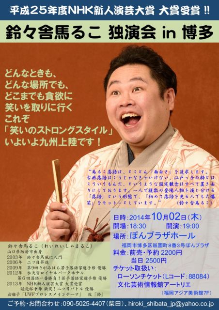 初の博多での独演会です。 どうぞよろしくお願いします。 「鈴々舎馬るこ 独演会 in 博多」 平成26年10月2日(木) 19:00開演 (開場18:30) ぽんプラザホール 福岡県福岡市博多区祇園町8番3号 ぽんプラザ 2,200円(前売り・予約) 2,500円(当日) ローソンチケット (TEL:0570-084-008)(Lコード:88084) アートリエ (TEL:092-281-0103) 前売り・予約 TEL:090-5025-4407(柴田) メール:hiroki_shibata_jp@yahoo.co.jp ローソンチケット(TEL:0570-084-008)(Lコード:88084) 文化芸術情報館アートリエ(TEL:092-281