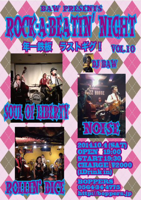 BAW PRESENTS ROCK-A-BEATIN' NIGHT vol.10 ǯ°ìÅ´ÈÄ¡¡¥é¥¹¥È¥®¥°¡ª 2014.10.4 (SAT) OPEN 19:00 START 19:30 CHARGE \2000 ( 1drink in) ¡ù¡¡SOUL OF LIBERTY ¡ù¡¡NOISE ¡ù¡¡ROLLIN' DICE ¡ù¡¡DJ BAW
