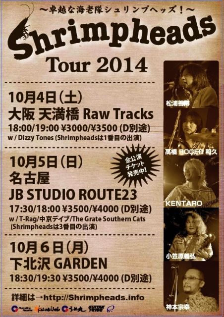 10月になりました!いよいよですよ〜。 秋のシュリンプヘッズツアー始まりま〜す! 初日の大阪10/4は 対バンにモンジさんのバンド''DIZZY TONES'' お楽しみだらけのツアーですね! チケット予約お早めに!!!こちらからどうぞ。 http://form1.fc2.com/form/?id=928922 Shrimpheads オフィシャルサイト http://www.shrimpheads.info/index.html ◆◆◆◆◆◆◆◆◆◆◆◆◆◆◆◆◆◆◆◆◆◆◆◆◆◆◆◆◆◆◆◆◆◆◆ Shrimpheads Tour 2014 【出演】 松浦善博(v.g)