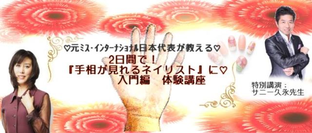 元ミス・インターナショナル日本が教える 『手相が読めるネイリスト』入門体験講座 ネイリストの方へ 手相鑑定スキルを加えて お客様のリピート率を倍にしませんか? ネイリストさんは、いつもお客様の指と爪を見ていらっしゃいますが、 実は、別な観点から見るとそこに多くの情報が隠されているのです。 健康状態はもちろんのこと、その人の性格まで知ることができます。 また手のひらを見れば、相手の恋愛相談や、仕事の悩みまで解決できます。