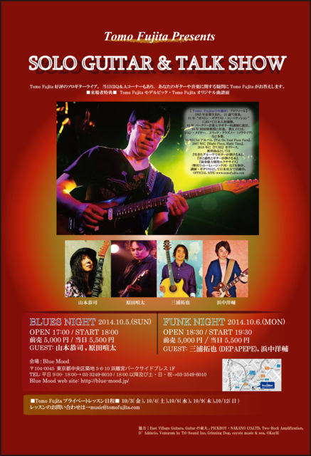 昨年大好評だった、Tomo Fujita一年ぶりのソロギターライブ。 今回は10月5日(日)BLUES NIGHTと10月6日(月)FUNK NIGHTの豪華2デイズです。 当日はTomo Fujitaのソロギター演奏をメインとして、両日ともに2人のゲストを迎えます。又、Q&Aコーナーもあり、あなたのギターや音楽に関する質問にTomo Fujitaが直接お答え致します。 <<来場者特典>> Tomo Fujitaモデルピック、Tomo Fujitaオリジナル曲譜面 【トモ藤田プロフィール】 1965年、京都生まれ。21歳で渡米。91年、“ボストン・ギタリスト・コンペティション”において日本人初優勝