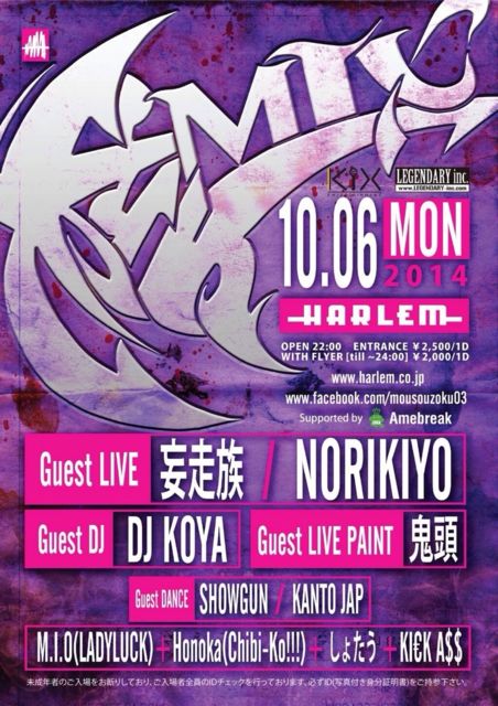 10/6(月)核MIX@渋谷HARLEM ☆★☆★☆★☆★☆★☆★☆★☆★☆★☆★ ■ゲストでの入場方法はエントランスにて、 【シノブのゲストでハーレム】 と伝えて頂ければディスカウント料金でご入場出来るのでご利用下さい! ディスカウント料金は... \1500/1d となります。 ☆★☆★☆★☆★☆★☆★☆★☆★☆★☆★ 10/6(mon) [核MIX] GUEST LIVE: 妄走族, NORIKIYO,Thaitanium from Bangkok GUEST DJ: KOYA DJ: SHINOBU GUEST DANCE: SHOWGUN, KANTO JAP, M.I.O(LADYLUCK) + HONOKA(Chibi-Ko!!!) + しょたう + KI€
