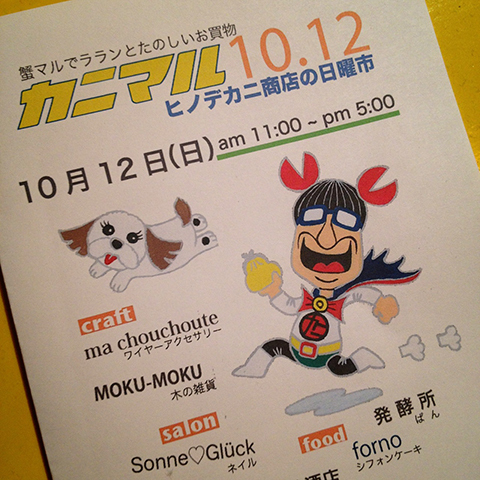 ********************************** 管理人さま 貴重なスペースをお借りして、大変ありがとうございます。 不適切な内容と判断されました場合、お手数ですが削除お願い致します。 ********************* ************* 太田市のヒノデカニ商店からのお知らせです。 今度の日曜日、10月12日は ヒノデカニ商店の日曜市『蟹マルシェ』です! 台風の動きは気になりますが。。。 きっと、大丈夫!晴れます!(笑) みなさまのお越しを心よりお待ちしておりま