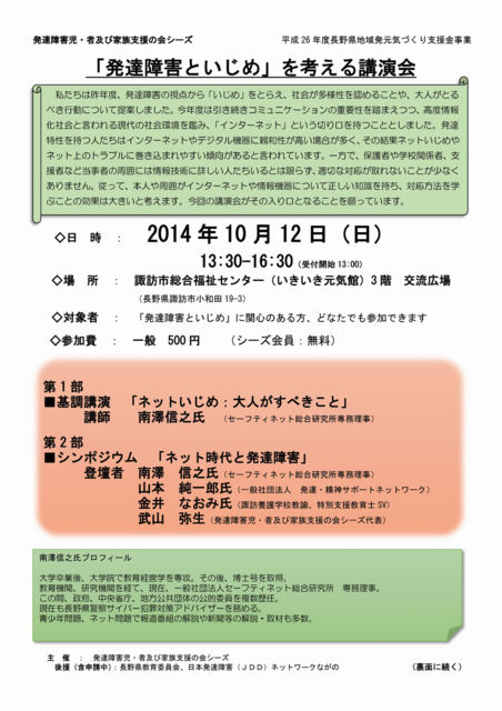 【会場はNeccoではなく、長野県・諏訪市総合福祉センター(いきいき元気館)です。参加される方はご注意ください。】 「発達障害といじめ」を考える講演会を開催します 私たちは昨年度、発達障害の視点から「いじめ」をとらえ、社会が多様性を認めることや、大人がとるべき行動について提案しました。今年度は引き続きコミュニケーションの重要性を踏まえつつ、高度情報化社会と言われる現代の社会環境を鑑み、「インターネット」という切り口を持つこととしました。発達特性を持つ人たちはインターネットやデジタル機器に親和性が高い場合が多く