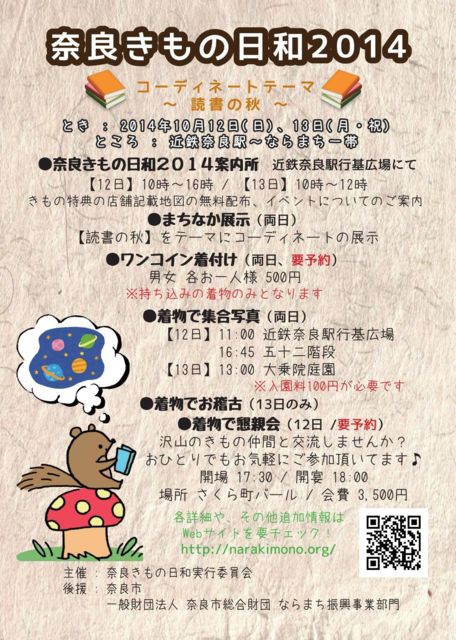 今年も恒例の秋のイベントを開催致します! 【2014年10月12(日)〜13(月祝)】 当日配布します散策マップ片手に奈良町を自由に散策して下さい♪ もちろん協賛店舗さまでの着物特典もアリます! 今年のコーディネートテーマは、 「読書の秋」!!! ※パンフレットは、近鉄奈良駅前の行基ひろば にて配布致します。