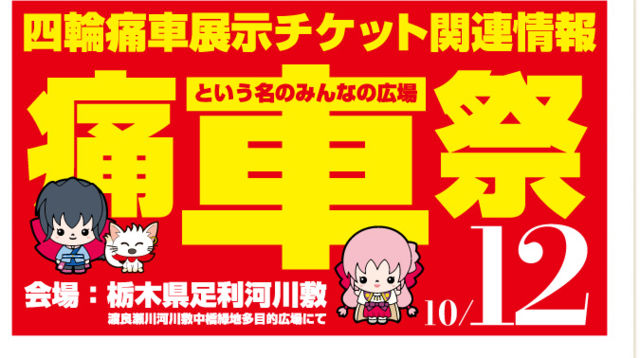 河川敷の会場に痛車!アイドル!コスプレ!グルメ!が大集合!みんな一緒に楽しみましょう♪ 痛車祭という名のみんなの遊び場!10月12日に足利に注目! 一般入場は無料です♪近隣の有料駐車場には数に限りがございますので電車でのご来場がオススメです! 前回痛車展示約350台!一般来場者約5000人!たくさんのコスプレーヤー!会場内のグルメ販売!ステージなどで盛り上がった足利痛車祭もおかげさまで第9回を迎えることとなりました! イベント当日は綺麗に整備された河川敷の広大なスペース全てを痛車やコスプレーヤーやグルメ販売が埋め尽く