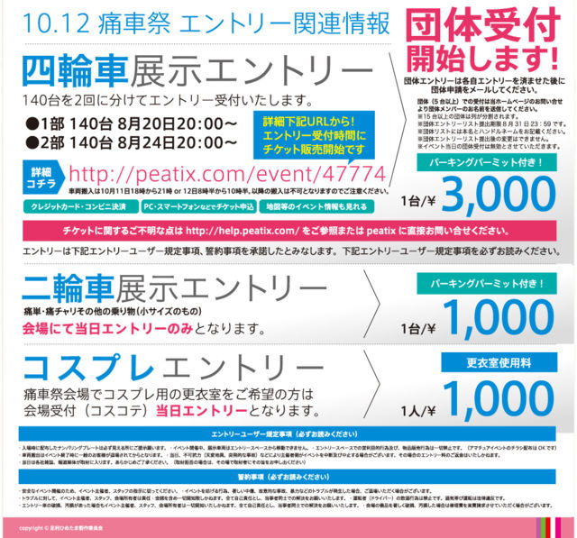このコニュニティのイベントトピックはイベントのエントリー応募ではなく、「参加表明・交流」のためのトピックです。募集期限が設定されていますが、エントリー募集とは関係ありませんのでご注意下さい。 第9回足利痛車祭 http://www.himetama.jp/ita_fes09.html 【 四輪痛車展示詳細】 10.12 第9回 足利ひめたま痛車祭 http://peatix.com/event/47774 http://www.himetama.jp/ita_fes09.html チケット1枚(3000円) 8.20 20:00〜(140台分) 8.24 20:00〜(140台分) 受付開始♪