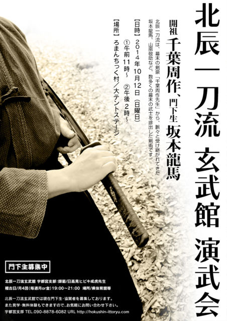 スペースお借りしますm(__)m 2014年10月12日(日曜日)に栃木県宇都宮市の 「ろまんちっく村」大テントステージにて北辰一刀流 玄武館の演武会を行います。 演武会は午前11時〜と午後2時〜の2回を予定しています。 北辰一刀流 は、幕末の剣豪「千葉周作先生」から、脈々と受け継がれてきた 坂本龍馬、山南敬助など、数多くの幕末の武士を排出した剣術です。 入場無料ですので是非ご覧下さい^^