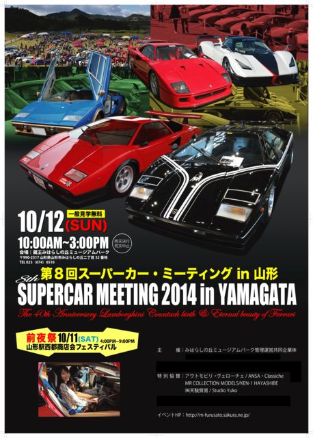 "8th SUPERCAR MEETING 2014 in YAMAGATA" Online Registration Starting! 「第8回 スーパーカー・ミーティング 2014 in 山形」参加募集開始! 皆様、長らくお待たせいたしましたが、本日平成26年10月12日(日曜日)開催予定、「第8回 スーパーカー・ミーティング 2014 in 山形」への参加募集開始となりました。既に本日の午後より、イベントHPにてweb申込みのページが開設されておりますので、皆様ふるってご参加ください! 尚今年度は前日の10/11(土)に、山形駅西口広場において山形駅西都商店会とのコラボレーションによるスーパーカーの