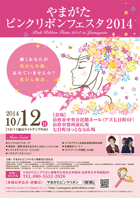 【やまがたピンクリボンフェスタ2014】 日時:2014年10月12日(日) 会場:山形市中央公民館ホール(アズ七日町6F)開場13:00 開演13:30 料金:無料(事前申込み必要) 詳細はやまがたピンクリボンフェスタ公式ホームページをご覧ください。 http://yamagata-pinkribbon.com/ *管理人さま、イベント・トピ立て失礼致します*