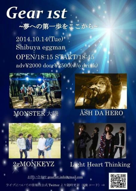 2014年10月14日(火)渋谷eggman 「Gear1st」 出演:MONSTER大陸/2gMONKEYZ/Light Heart Thinking/ASH DA HERO OPEN 18:15/START 18:45 adv.\2,000/door.\2,500(1drink別/オールスタンディング) チケット:9月20日(土)より発売 ローソンチケット(L-76068)・e+ INFO:渋谷eggman 03-3496-1785 http://eggman.jp/daytime/