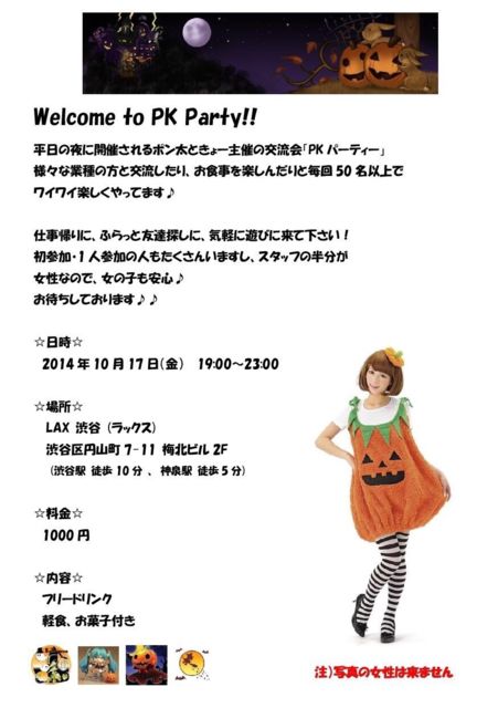 管理人様、貴重なスペースありがとうございます。 始めましてー☆ KENです(´・Д・)」 今年もハロウィンの時期がきました★ さて、どんなコスプレをしようか♫ 渋谷のオシャレなカフェでDJが流す心地よい音楽の中で みんなで楽しい時間を過ごしましょぅヽ(´o`; 50人くらいのイベントですが、初めての人も多いので 初オフ会って人もお気軽にどうぞ (^ ^) 参加希望の方は僕宛にメッセくださいV(^_^)V あと、ナンパ・勧誘とか迷惑行為はやめてくださぃ(♯`∧´) よろしくでーす(*^_^*)