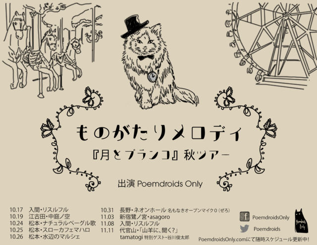 ポエムドロイズオンリー ものがたりメロディ『月とブランコ』日本秋ツアー 2014年10月19日(日) 12:00〜17:00 詩人高山宙丸が主宰する、ポエトリーリーディングユニット。 「ポエムドロイズオンリー」 カナダバンクーバーから帰国の秋ツアー。 せっかくだからオープンマイクもしちゃいましょう!と言うことで、 ポエトリー三昧だよ中庭ノ空♪ 二部構成でお届けします。 ★ 第一部 ポエムドロイズオンリー ライブ 12〜14時 投げ銭+1オーダー ★第二部 オープンマイク 14時半〜エントリー受付、15時スタート!〜17時 持ち時間一