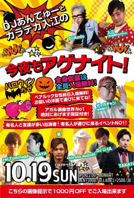 14/10/19(Sun) 22:00~ 【今夜もアゲナイト】 @CLUB camelot −−−−−−−−−− 特別ディスカウント希望の方は、エントランスにて 「ユウタのゲストでミク」と言って頂ければ、 ◆Discount Guest M 2,000/1d W 1,500/1d でのご入場が可能です。 ■全身仮装で入場無料! ■ペアルック女性終日入場無料! ■アガル選曲世界NO1イベント! ■有名人と友達が多い出演者!有名人が遊びにくるイベントNO1! ■芸能人も参加するハロウィンパーティー! System MEN¥3000/1d WOMEN¥2500/1d DJ Ando / 入江(吉本興業) / 嵐 / デッカチ