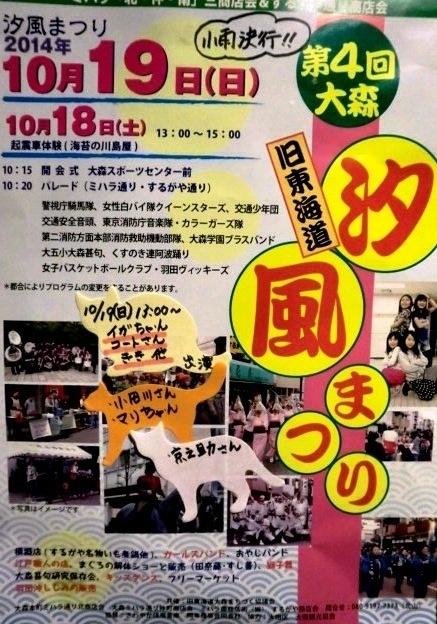 【ふぉ〜く処cocoro関連イベント】 ♪10月19日(日) 10時〜16時/小雨決行 第4回「 旧東海道大森 汐風まつり」 路上ライブ ライブは13時開始です! 出演 イガちゃん / コートさん / 小田川さん まりちゃん / 京之助さん/ けんさん / きき (順不問) 10時過ぎから10団体のパレード&阿波踊りが四つの商店街を行進します。 路上ライブのステージは