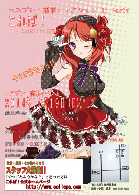 このコニュニティのイベントトピックはイベントのエントリー応募ではなく、「参加表明・交流」のためのトピックです。募集期限が設定されていますが、エントリー募集とは関係ありませんのでご注意下さい。 http://collepa.com/place/area/stone これぱ!のコスプレ・痛車イベントが博石館で、 2014年10月19日(日)に初開催決定! 博石館は日本一大きなピラミッドで有名なんです! 地下迷宮の中での撮影、披露宴会場のロケーションで コスプレ撮影をお楽しみ下さい。 ☆ イベント概要 http://collepa.com/place/area/