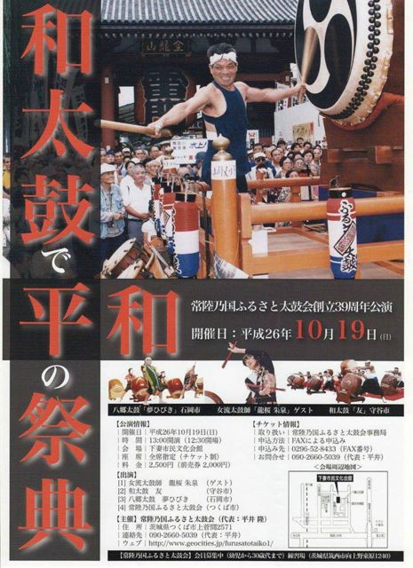 2014年10月19日(日) 和太鼓で平和の祭典 常陸乃国ふるさと太鼓会 創立39周年記念公演 ☆出演者☆ ・ ゲスト 女流太鼓師 龍桜 朱泉(愛知県) ・ 和太鼓 友(茨城県守谷市) ・ 八郷太鼓 夢ひびき(茨城県石岡市) ・ 常陸乃国ふるさと太鼓会(茨城県つくば市) 場所:茨城県下妻市 下妻市民文化会館 時間:12時半 開場 13時開演 チケット料金: 前売り 2,000円 当日 2,500円(全席指定) チケット問い合わせ:ふるさと太鼓 代表 平井まで! ・TEL 0296−52−8433 ・FAX 0296−52−