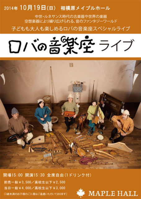 管理人様 イベント告知、失礼いたします。 相模原メイプルホールに、【ロバの音楽座】2年連続登場です!! 10月19日(日) 【ロバの音楽座ライブ】 子どもも大人も楽しめるロバの音楽座スペシャルライブ OPEN/15:00 START/15:30 全席自由(1ドリンク付き) 前売 一般¥3,500/高校生以下 ¥2,500 当日 一般¥4,000/高校生以下 ¥3,000 (3歳未満のお子様のご入場はご遠慮いただいております) 相模原メイプルホール http://www.maple1990.com/ 好評発売中です。 皆様のご予約、ご来場お待ちしております♪