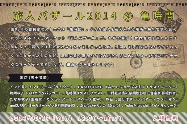 旅人によるフリーマーケット「旅人バザール2014」 今年もバラエティに飛んだ方々の出店が決定いたしました。 例年通り、雑貨や旅にまつわるモノの販売はもちろん、タイマッサージ、似顔絵人形まで登場。 cafe kamejikanも特別メニューで営業いたします。 【旅人バザールとは】 ========================================== 築88年の古民家ゲストハウス「亀時間」。そんな旅人を迎え入れる場所で毎年恒例の旅人たちによるフリーマーケット『旅人バザール』が、今年も開催!世界各地を旅したとき、
