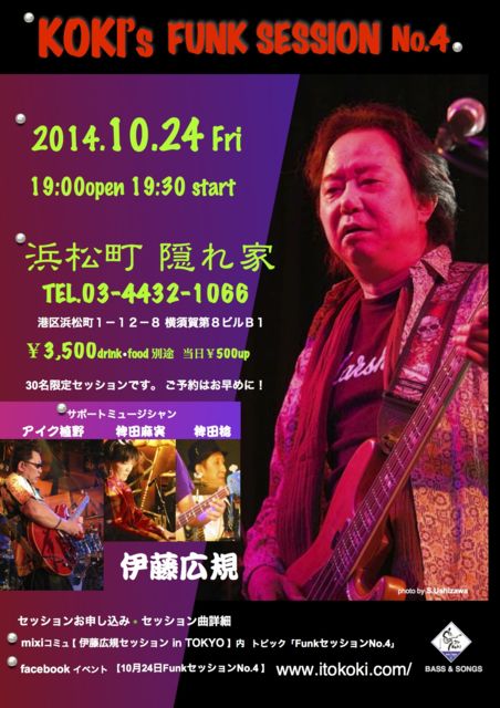 前回も大好評でしたスーパーファンクセッション!! 今回も伊藤広規さんと一緒に盛り上りましょう♪ 山下達郎さんのバンドのベーシストで活躍中の 伊藤宏規さんのスーパーファンク・セッション・ナイトを開催します!! ●オープン 19:00 スタート 19:30〜 (セッションリスト) ●Got To Be Real / シェリル・リン ●Boogie Woogie Woogie / テイスト・オブ・ハニー ●Lady Marmalade / ラベル ●Rock Steady / アレサ・フランクリン ●Dancing In The Street / アレサ・フランクリン ●Miracles / ジャクソン・