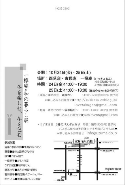 君知るや 花の林を紅葉狩り 几菫 秋から冬へ お着物を着て出かけたくなる時季ですね ^^ 今週末、西荻窪の登録有形文化財の邸宅で 一欅庵 和の暮らし展 「冬を楽しむ、冬を包む」 開催です。 ▼ イベント詳細 http://sukiraku.exblog.jp/20247911/ 格安のお着物・羽織・帯はじめ 8作家が集う展示、(ガラス、水引、つまみ細工、お草履, 和のせっけん、柄足袋etc) 袋帯のWSやバスボムづくりのWS等 楽しめる内容となっております。 ご興味惹きましたら、 遊びにいらしてください。 -- 日時:10