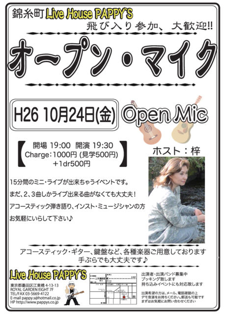 10/24(金)『オープンマイク』のお知らせです。 ホスト:梓(ティ〜ダ) 開場19:00 開演19:30 チャージ:1000円(見学500円)+1ドリンク500円 久々の梓さんの司会進行です♪ アコースティックで3曲(持ち時間15分)の飛び入り参加の出来るイベントです。 アコギ、エレピの準備もしてありますので、お気軽に遊びにいらしてください♪ お待ちしております。 ♪♪♪♪♪♪♪♪♪♪♪♪♪♪♪♪♪ Live House PAPPY'S 130-0022 東京都墨田区江東橋4−13−13 ロイヤルガーデンエイトビル7F TEL/FAX:03-5669-4122 E-mail:pa