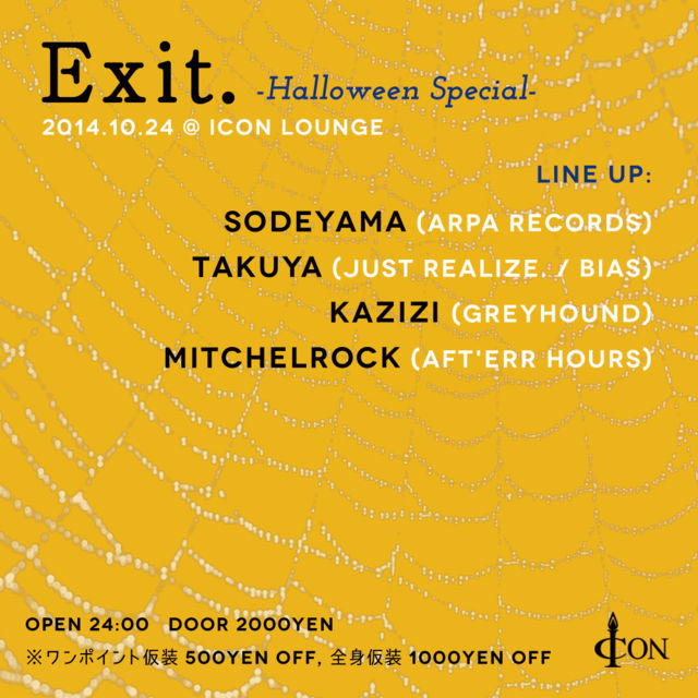 渋谷ICON、 今年のHalloween Partyは10/24(金), 10/25(土), 11/1(土)の3日間で開催決定! 10/24(金)の「Exit.」には、DJ Sodeyama等都内の主要CLUBで活躍するDJが集結します。 ------------------------------ 10/24(FRI) Exit. -Halloween Special- LINE UP: SODEYAMA (ARPA Records) TAKUYA (Just Realize. / BIAS) KAZIZI (Greyhound) MITCHELROCK (Aft'err Hours) OPEN 24:00 DOOR 2000YEN ※ワンポイント仮装 500YEN OFF, 全身仮装 1000YEN OFF http://jp.residentadvisor.net/event.aspx?647515 https://www.facebook