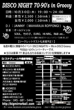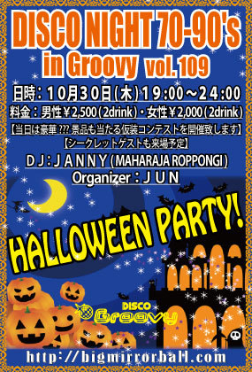 【おなじみGroovyのディスコナイト】70年代のSOULミュージックから最新のEDMまでオールヒットメドレー!踊れる曲盛り沢山でお贈りします♬ 今回はハロウィンパーティーです。https://www.facebook.com/DISCONIGHTGroovy 【オーガナイザー】JUN 【当日は豪華???景品も当たる仮装コンテストを開催致します】 【シークレットゲストも来場予定!】 【DJ】 JANNY(MAHARAJA ROPPONGI) 【音楽】ALL GENRE (SOUL、竹の子、ダンクラ、EURO、HI-NRG、TECHNO、R&B、EDM、etc…) 【開催時間】 19:00〜24:00 【料金】 男性: