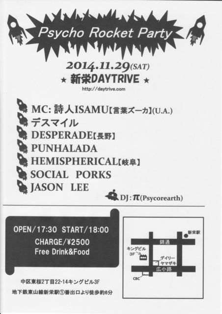 ´ÉÍý¿ÍÍÍ¡£ ¤«¤Ê¤êÀè¤Î»ö¤Ç¤¹¤¬(¶ì¾Ð)Á°°Ê¤Æ¹ðÃΤµ¤»¤Æ²¼¤µ¤¤¡£ ¢¢11/29(ÅÚ) ¡ÚTITLE¡Û ¡ØPsychoRocketParty¡Ù @¿·±É¡ÖDAYTRIVE¡×̾¸Å²°»ÔÃæ¶èÅìºù2ÃúÌÜ22ް14¥¥ó¥°¥Ó¥ë3F http://www.daytrive.com ¡ÚOPEN/START¡Û 17:30/18:00 ¡ÚCHARGE¡Û \2,500(FreeDrink&FreeFood) ¡ÚBAND¡Û Ž¥JASON Lee Ž¥HEMISPHERICAL(´ôÉì) Ž¥DESPERADE(ĹÌî) Ž¥SOCIAL PORKS Ž¥PUNHALADA Ž¥¥Ç¥¹¥Þ¥¤¥ë ¢¨Á´6BAND ¡ÚDJ¡Û Ž¥¦Ð(Psycorearth) ¡ÚMC¡Û Ž¥ISAMU(¸ÀÍÕ¥º¡¼¥«)¢¨U.A(10:00¡Á) ¤«¤Ê¤êÌÌÇò¤¤¥¤¥Ù¥ó¥È¤Ë¤Ê¤ë»öÀÁ¤±¹ç¤¤¡ª À§Èó¡ªÍ·¤Ó