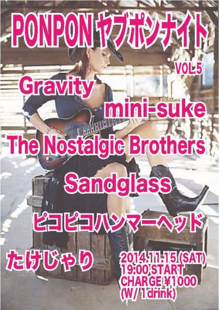 PONPON¤ä¤Ö¥Ý¥ó¥Ê¥¤¥È vol.5 2014.11.15 (SAT) 19:00 START CHARGE \1000 (1¥É¥ê¥ó¥¯ÉÕ¤¡Ë ¡ù¡¡Gravity ¡ù¡¡mini-suke ¡ù¡¡The Nostalgic Brothers ¡ù¡¡Sandglass ¡ù¡¡¥Ô¥³¥Ô¥³¥Ï¥ó¥Þ¡¼¥Ø¥Ã¥É ¡ù¡¡¤¿¤±¤¸¤ã¤ê