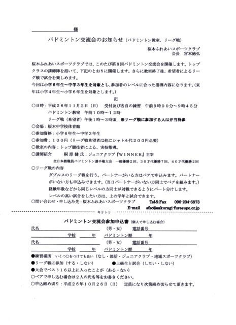¡ûÆü»þ¡§Ê¿À®£²£¶Ç¯£±£±·î£²Æü¡ÊÆü¡Ë¡¡¼õÉյڤӳƼ«¤ÎÎý½¬¡¡¸áÁ°£¹»þ£°£°Ê¬¡Á£¹»þ£´£µÊ¬ ¥Ð¥É¥ß¥ó¥È¥ó¶µ¼¼¡¡¸áÁ°£±£°»þ¡Á£±£²»þ ¥ê¡¼¥°Àï¡Ê´õ˾¼Ô¡Ë¸á¸å£±»þ¡Á£³»þº¢¡¡¢¨¥ê¡¼¥°Àï¤Ë»²²Ã¤¹¤ë¿Í¤ÏÊÛÅö»ý»² ¡û²ñ¾ì¡§·§ËܻԺùÌÚÃæ³Ø¹»Âΰé´Û ¡û¼çºÅ¡§ºùÌڤդ줢¤¤¥¹¥Ý¡¼¥Ä¥¯¥é¥Ö ¡û»²²Ã»ñ³Ê¡§¾®³Ø£¶Ç¯À¸¡ÁÃæ³Ø£³Ç¯À¸¡¡ ¡û»²²ÃÈñ¡§£±£°£°±ß¡Ê¥ê¡¼¥°Àï´õ˾¼Ô¤Ï¾¤Ë¥·¥ã¥È¥ëÂ売£°£°±ßɬÍ×¡Ë ¡û¶µ¼¼¤ÎÆâÍÆ¡§¥È¥Ã¥×¶¥µ»¼Ô¤Ë¤è¤ë¡¢¼Âµ»»ØÆ³¡£ ¡û¹Ö»Õ¾Ò²ð ¶Í¸¶·ò»á¡§¥¸¥å¥Ë¥¢¥¯¥é¥Ö¡Ø£×£É£Î£Î£Å£Ò¡Ù¼çºË Á´ÆüËܶµ¿¦°÷¥Ð¥É¥ß¥ó¥È¥óÁª¼ê¸¢Âç²ñ
