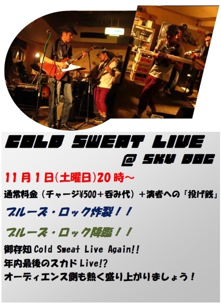 COLD SWEAT LIVE @ SKY DOG 11月1日(土曜日)20時〜 通常料金(チャージ\500+呑み代)+演者への「投げ銭」 ブルーズ・ロック炸裂!! ブルーズ・ロック降臨!! 御存知Cold Sweat Live Again!! 年内最後のスカドLive!? オーディエンス側も熱く盛り上がりましょう!