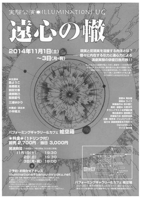 実験公演◎ILLUMINATION(いりゅみなしおん)◎『遠心の轍』 『現実と反現実を溶接する肉体とは? ー個々に内在する引力と遠心力による 演劇実験の俳優日蝕月蝕!!』 …って、何なんだ??? 演劇実験室・万有引力の小林桂太が、中核を担う俳優達の力を借り、若手俳優陣ならではの「演劇の冒険」をプロデュースします。 文化の薫る11月、是非江戸川橋へお越しください! 【公演日時】(1時間前より受付開始、30分前に開場) 2014年 11月1日(土) 19:30 11月2日(日) 19:30 11月3日(月・祝) 18:00 【出演】