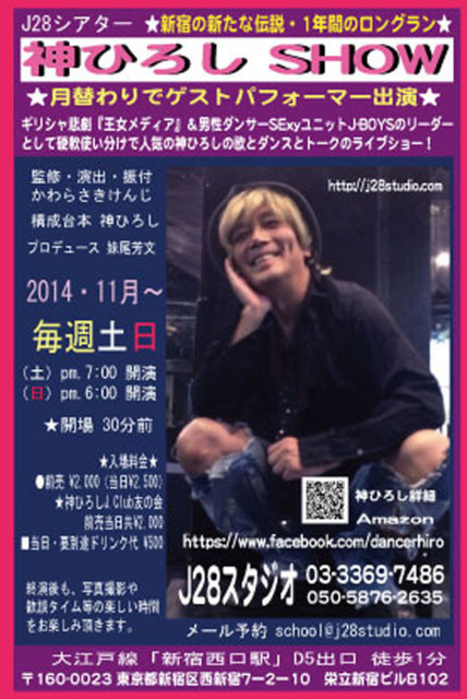 『神ひろし SHOW』出演者募集〜ダンス&歌&トーク〜★11月より毎週(土)(日)新宿J28スタジオ ◎「神ひろしSHOW」出演者募集!〜ダンサー・歌手&トークショーゲスト〜http://j28studio.com/archives/3048.html ◎J28シアター・『神ひろし SHOW』 http://j28studio.com/archives/3051.html ◎神ひろしSHOW ホームページ http://j28studio.wix.com/hiroshow