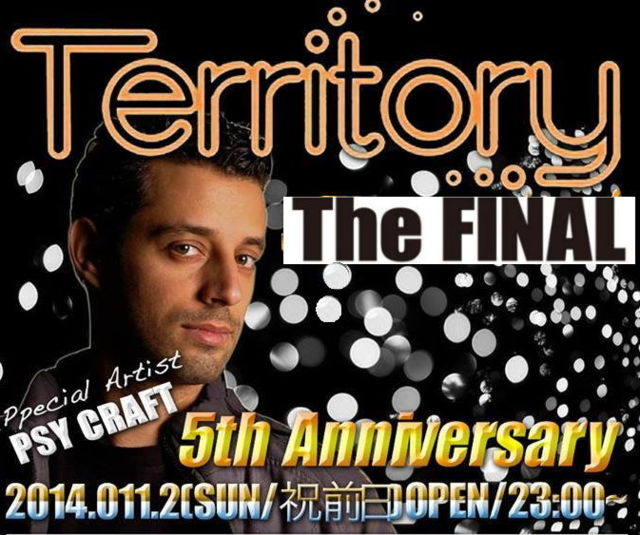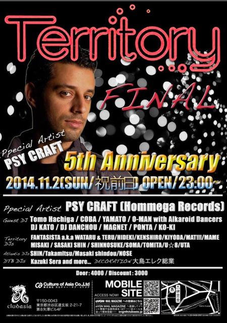 11/02(½ËÁ°Æü) ½ÂëASIA PSY CRAFTÍèÆü¡ª Territory FINAL 5th Anniversary ¥Æ¥ê¥È¥ê¡¼ºÇ¸å¤Î¥¤¥Ù¥ó¥È¤Ç¤¹¡ª TerritoryºÇ¸å¤ÎParty¤ò PSYCRAFT¤¬¾þ¤ê¤Þ¤¹ ¢£Date¢£ 2014.11.02 ¢£Place¢£ Club ASIA ¢£OPEN¢£ 23:00¡Á08:00 ͽÄê ¢£Door¡ï4000 ¡úDiscount¡ï3000 ¼õÉÕ¤ÇÃÄĹ¤Î¥²¥¹¥È¤È¸À¤Ã¤ÆÄº¤±¤ì¤Ð ¥Ç¥£¥¹¥«¥¦¥ó¥ÈÎÁ¶â¤Ë¤Ê¤ê¤Þ¤¹ ¡ÚSpecial Artist¡Û ¡¦PSY CRAFT ¡ÚGuest DJ¡Û ¡¦Tomo Hachiga ¡¦COBA ¡¦O-MAN with Alkaroid Dancers ¡¦DJ KATO ¡¦ÃÄĹ¡¡ ¡¦MAGNET a.k.a ¡¡¡¡TOMOHE