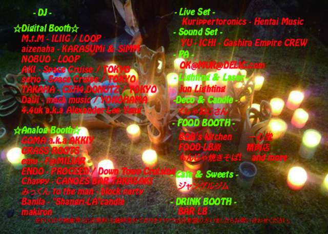 ´ÉÍý¿ÍÍÍ¡¢¹ðÃμºÎ餤¤¿¤·¤Þ¤¹¡£ GW¤Ë³«ºÅ¤·¤¿River Side Party Camp Fes ¡Ê¥ê¥Ð¥µ¥¤¡Ë¤«¤éÌóȾǯ¡£ º£Ç¯¤â¤¦1²ó³«ºÅ¤·¤Æ¤Û¤·¤¤¤È¤¤¤¦Í×˾¤Ë¤ª±þ¤¨¤·¤Þ¤·¤Æ Íèǯ¤Î10¼þǯ¤Ë¸þ¤±¤Æ¤Î·Ú¤¤¥¹¥Æ¥Ã¥×¥¢¥Ã¥×¤È¤¤¤Ã¤¿´¶¤¸¤Ç¡£ Ä«¤«¤éͼÊý¤Þ¤Ç¤Îû¤¤»þ´Ö¤Ë¤Ê¤ê¤Þ¤¹¤¬¡¢ ¤æ¤ë¡Á¤¯¡¢¤Ï¤ä¡Á¤¯¡£ º£²ó¤Ï¡¢»þ´Ö¤â¥Ç¥¤¤Î¤ß¤Ç¤¹¤Î¤Ç¡¢ ¥Ç¥¸¥¿¥ë¥Ö¡¼¥¹¡¢¥¢¥Ê¥í¥°¥Ö¡¼¥¹¤Î2¥Ö¡¼¥¹ ¤Ç³«ºÅ¤¤¤¿¤·¤Þ¤¹¡£ ½Ð±é¼Ô¤âÁíÀª18ÁȤÎDJ¿Ø¤¬Åߤ䨤µ¤ò ¿á¤Èô¤Ð¤·¤Æ¤¯¤ì¤ë¤³¤È¤Ç¤·¤ç¤¦¡£ ¤´Íè¾ì¤Ë¤Ê¤ëºÝ¤Ë¤ÏÃí°Õ»ö¹à¤òɬ¤º¤´³Îǧ¤Ë ¤Ê¤Ã¤Æ¡¢¤´Íè¾ì¤¯¤À¤µ¤¤¤Þ