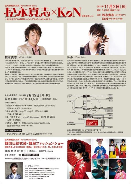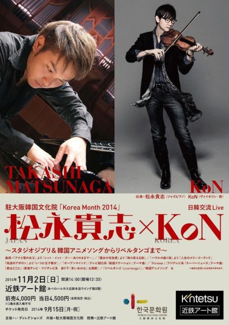 ジャズピアニスト松永貴志さんと韓国の歌うヴァイオリニストKoNさんによるLiveを11月2日(日)近鉄アート館にて開催します!! スタジオジブリ「魔女の宅急便」、アナと雪の女王「レット・イット・ゴ―」、坂道のアポロン「いつか王子様が」から「リベルタンゴ」まで家族で楽しめるナンバーでお届けします!! 松永貴志さんとKoNさんの迫力あるセッションをお楽しみください♪ 駐大阪韓国文化院「Korea Month 2014 」 松永貴志✕KoN 日韓交流Live 〜スタジオジブリ&韓国アニメソングからリベルタンゴまで〜 【日時】11月2日(