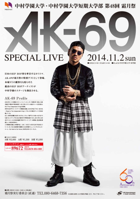 LIVE] OPEN 13:00 START 14:00 [チケット] 全席指定 S席2,000円 A席1,500円 B席1,000円 [ローチケ]Lコード:89672 [電話予約]0570-084-008 [出演者] ■GUEST LIVE AK-69 [INFORMATION] 霜月祭実行委員会(直通)TEL 080-6468-7356 中村学園大学 〒814-0198 福岡県福岡市城南区別府5-7-1