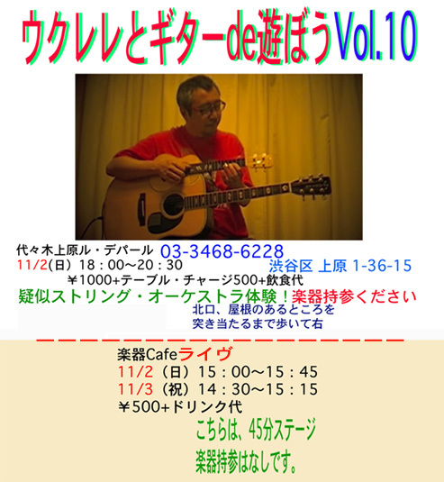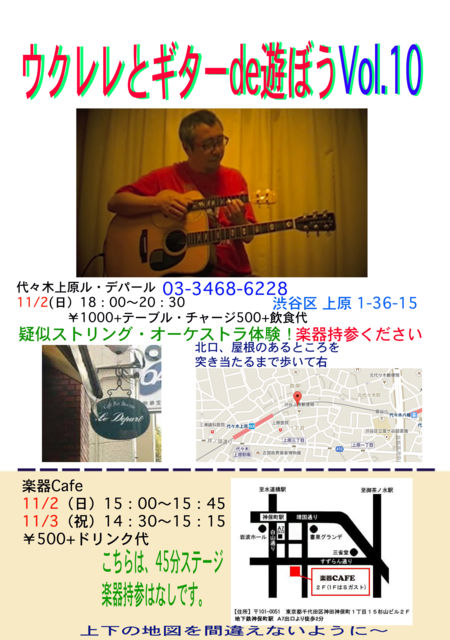 11月2日、日曜日。 代々木上原ル・デパールにて、 『ウクレレとギターde遊ぼうVol.10』やります。 loveledepart.tumblr.com その前後に、神保町でも短いライヴ演奏はしますので、 地方の人も、是非、連休は東京で〜〜〜〜。