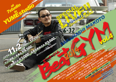 フレンドリーな雰囲気あふれるレッスンイベントシリーズ、ビートジム。 好評のうちに、ついに本年度のシリーズもクライマックスを迎えました。 シリーズ最終第4弾は、恒例、レッスン生さんと高橋まことによるスペシャル・セッションライブを開催するんです!! ビート・ジムで培ったドラム技術、成果を存分に発揮して楽しく賑やかにライブを楽しみましょう!! そして、これも恒例、ライブの後には盛り上がること必須の食事会もあります! 観覧希望の方や食事会のみ参加の方もお気軽にお越しください! BEAT GYM 2014 Vol,4 開催日時