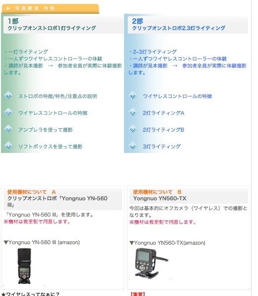 11/2(日)m-Gra写真教室 「クリップオンストロボをもっと使いこなしたい!」 1部「クリップオンストロボ1灯ライティング編」 2部「クリップオンストロボ2.3灯ライティング編」 ワイヤレスコントローラーを使って スピーディーで繊細なライティングテクニックを身につけよう ワイヤレスで光量コントロールできる「新型トリガー」!も登場 お申し込みはこちらから↓ http://m-koji.com/2014a/photoschool/141102.html