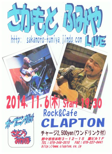 11月6日(木) 19:00オープン 19:30スタート 『 さかもと ふみや LIVE!』 さかもとさんの歌には、情景が見える。 久々のCLAPTON単独LIVE!! オープニングAct さとう みかほ ミュージックチャージ 2,500円(ワンドリンク付)