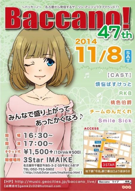 Baccano¡ª-47th- 2014/11/8(ÅÚ) OPEN¡§16:30¡¡START¡§17:00 ¾ì½ê¡§Imaike Club3star (̾¸Å²°»ÔÀé¼ï¶èº£ÃÓ5-3-2 GSº£ÃÓ¥Ó¥ëB1F) ¥Á¥±¥Ã¥È¡§¡ï1,500(1DrinkÊÌÅÓ¡ï500) 17:00¡Á ÈÑǺ¤Ð¤¹¤±¤Ã¤È 17:50¡Á RKB 18:40¡Á Åí¿§Çì¼ß 19:30¡Á ¥Á¡¼¥à¤Î¤ó¤À¤¯¤ì 20:20¡Á SmileSick »þ´Ö¤ÏÌܰ¤Ȥʤê¤Þ¤¹¤Î¤Ç¤ªÌÜÅö¤Æ¤Î¥Ð¥ó¥É¤¬¸æºÂ¤¤¤Þ¤·¤¿¤é¤ª»þ´Ö¤Ë;͵¤ò¤â¤Ã¤Æ¤ª±Û¤·²¼¤µ¤¤¡£