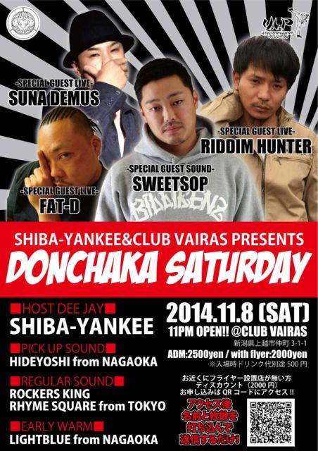 管理人様、告知失礼いたします。 2014今年最後のDONCHAKA SATURDAY !! 気になる今回のスペシャルゲスト、まずは2回目の登場、鼻息の荒い浜の猛犬、ミスターカオスことFAT -D!!タフ&ロフなボイスバイブスくらうはず!!ライブ後のホールでのダンスパフォーマンスも必見の価値あり(笑) そして初登場、3組!!まずは、COME FROM 相模原、孤高のリリシスト、スゥィートスナフキン、RIDDIM HUNTER !!メロウな旋律は秀逸、歌い上げるスタイル堪能あれ!!そして、謎のベールに包まれたYOUNG DEEJAY 、独特な低温ダミ声いわゆるNICO DEM
